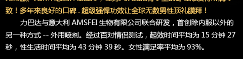也是在网上论坛中无意中看到有人此产品,之前也使用过很多几十块的产品,效果都不是很好,而且用了之后一点感觉都没有.我也狠下心,买了一瓶加强版10毫升的回家试试.第一次喷了2下. 43分钟不射是啥感觉?老婆说你怎么那么猛啊?老婆快吃不消了,是啥感觉?第二天起来自己两腿也软了 是啥感觉?我操 这TMD的真是不错的一款延迟效果的药.真心好用.我也推荐给大家.同时也感谢力巴达喷剂,让我找回了20岁的感觉.本人30了.