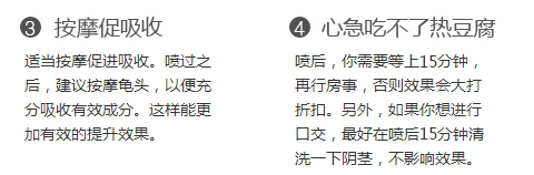 第一次喷的时候没有把握好量,用到第三次终于知道自己合适的用量了。客服说的有道理,人都是不一样的,有的吃一个馒头撑得慌,有的5个馒头吃不饱。要找到合适自己的。以后就按这个量用力巴达了。老婆和其他老婆们都很满意,哈哈。